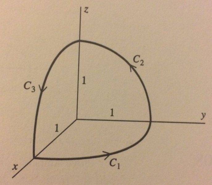 S, the octant of the sphere x2 + y2 + z2 = 1 enclosed by the three arcs.