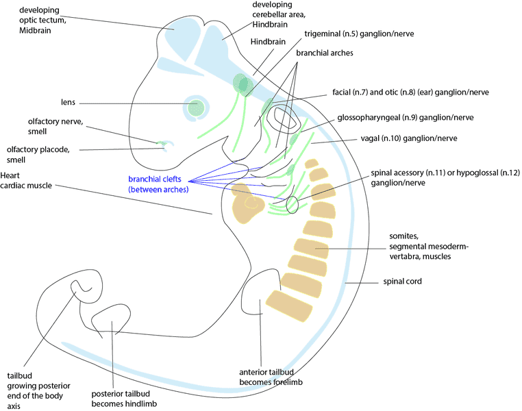 All of these embryo parts are conserved among and found in all vertebrates. They all share the same embryological layout, which generates similar but different adult forms. You can see all these parts (in distorted form) in fish, frog, bird, whale, and human embryos.