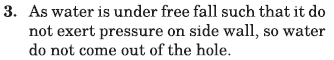 When a vessel of water is in free fall, water does not exit through a hole in the side due to the absence of pressure difference. Both the vessel and the water fall with the same acceleration, resulting in no net force acting on the water that would push it out. The pressure exerted by the weight of the water is neutralized as the vessel falls, leading to equal pressure at different levels of the liquid. This phenomenon is explained using Newton's laws, confirming that under free fall conditions, the forces acting on the water balance out.
