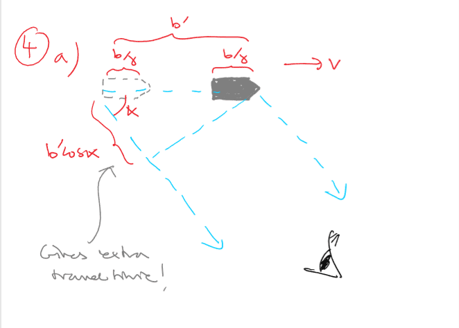 that is, the contracted length of the bullet plus its travel distance from the rear emission event. Given that L and θ can be expressed in terms of k and the other variables, we se that we can solve (implicitly, at least) for b' in terms of k, b and α.