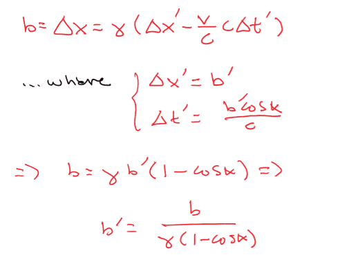 Plugging this in (2) immediately gives:b' = b / [γ(1-βcosα)], β=v/c