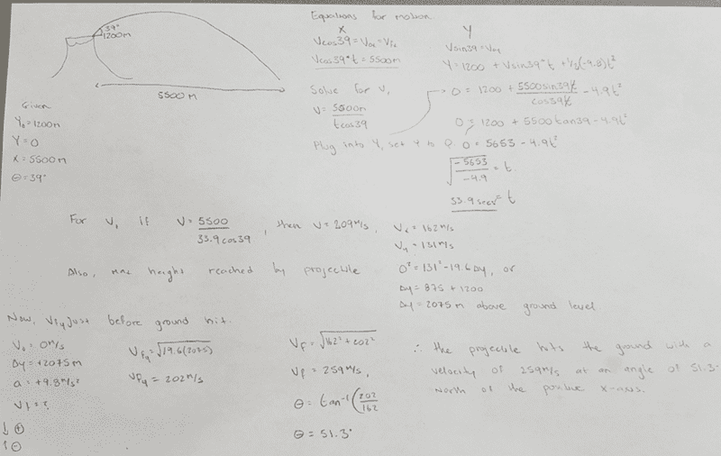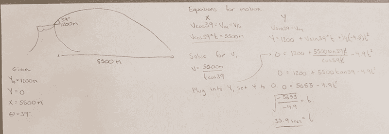 The discussion revolves around a physics problem related to projectile motion, specifically involving a rock ejected from a volcano at a 39-degree angle from an elevation of 1200 meters, with a horizontal range of 5500 meters. Participants are exploring the relationships between horizontal and vertical motion equations in the context of this scenario.
