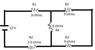 - Participants are attempting to calculate total resistance and individual voltages and currents through various resistors. There are questions about the configuration of resistors R3 and R5 in relation to the battery, and whether the calculations for voltage and current are accurate.