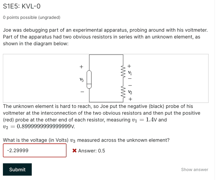 - The unknown element is hard to reach, so Joe put the negative (black) probe of his voltmeter at the interconnection of the two obvious resistors and then put the positive (red) probe at the other end of each resistor, measuring ##v_1=1.4V## and ##V_2=0.89999999V##.