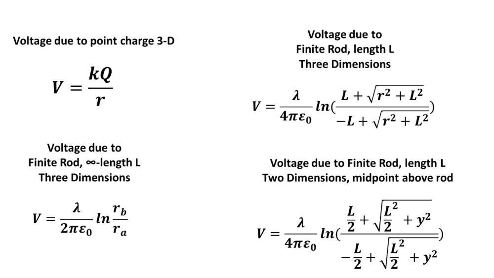 Question 3. I have never seen any calculations for the potential to distinguish between two dimensions or three-dimensions? Does the voltage expression change between two and three dimensions? I have never seen any calculations for the voltage due to these configurations expressly developed for one case or the other but would be glad to know where to find them. My equations above are what I understand about this last question.