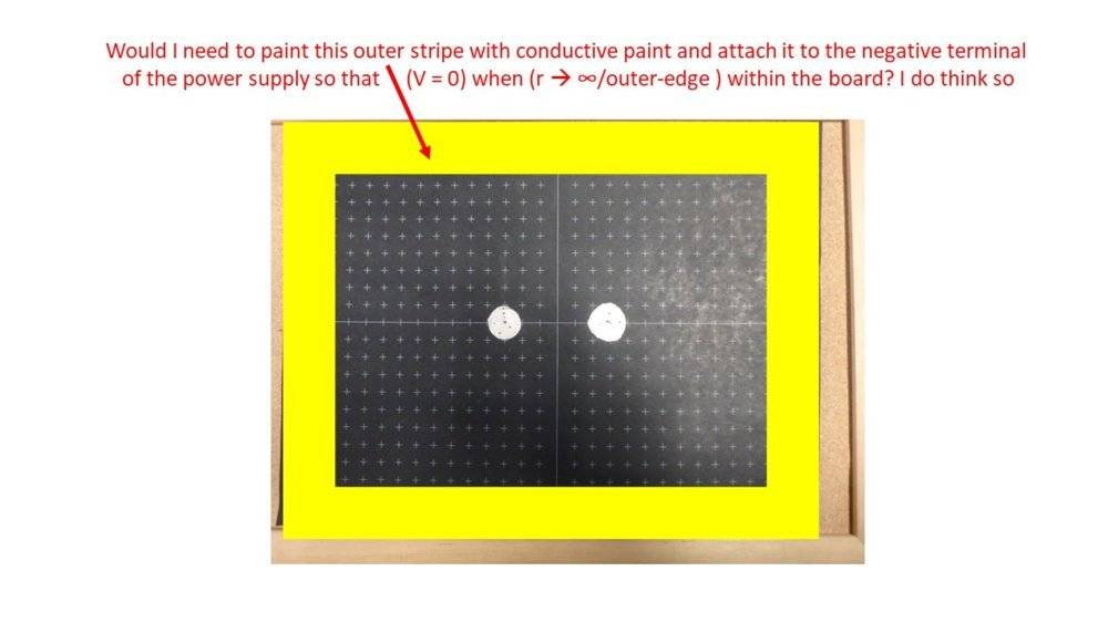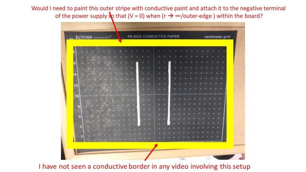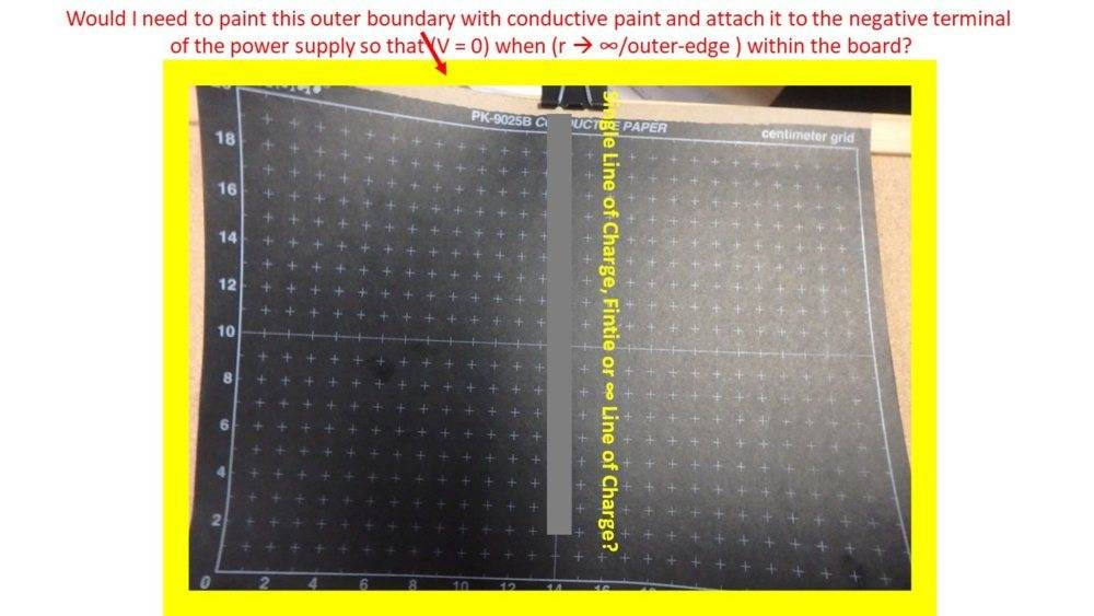 Question 1: In the slides “Dipole.jpeg”, “LineOfCharge.jpeg”, “ParLines.jpeg”, “PointCharge.jpeg”, do I need to paint a conductive stripe (attached to the negative to terminal of the power supply) on the edges of my conductive paper, so that V --> 0 as r --> ∞?