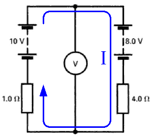 In the circuit below the batteries have negligible internal resistance and the voltmeter V has a very high resistance. What would be the reading of the voltmeter?