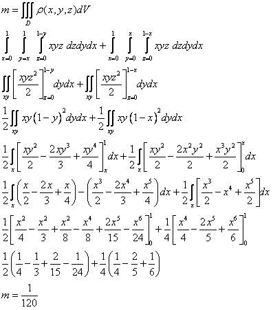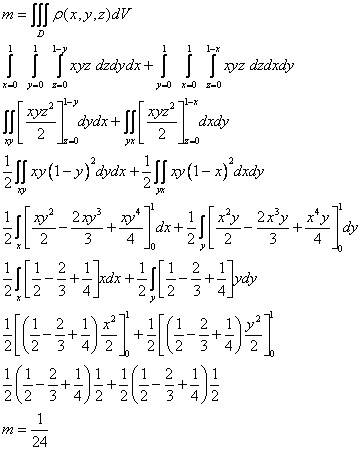 Find exactly the volume in the first octant under the planes x + z =1 and y + z =1. Find the mass if the density is p(x,y,z)=xyz.