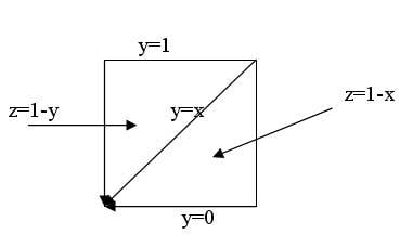 This is a pyramid in shape, so for the volume, rather than constructing a double integral, I used the formula V= Bh/3 which is equal to 1/3.
