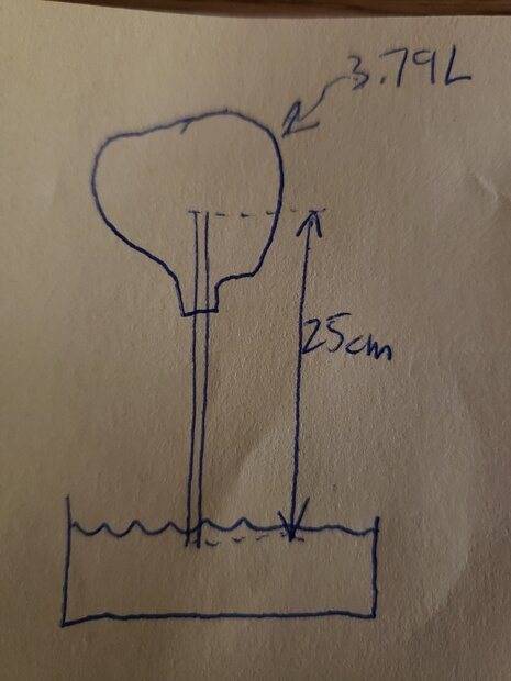 I'm trying to do the math for a backyard thermodynamic pump experiment, and getting stuck. Suppose an empty 3.79 liter container was airlocked by a vertical 25 cm long empty tube whose end sits at the top of an unlimited supply of water in a basin. The tube protrudes through the container such that there is a length of tube above the base of the container so that any water entering the container cannot escape back down the tube and into the basin. If the temperature of the external environment, water, and gas are all constant (295°K), what volume of water (density of 1000 kg/m3) would enter the container if the pressure differential between of the external environment (100 kPa) and the inside the container (96 kPa) is 4 kPa?