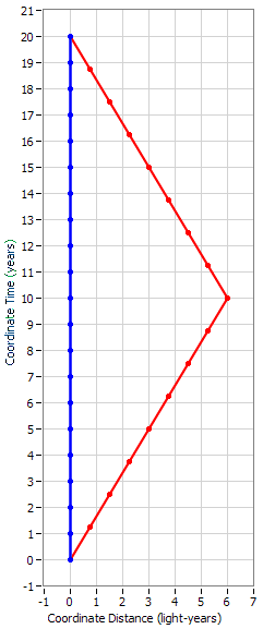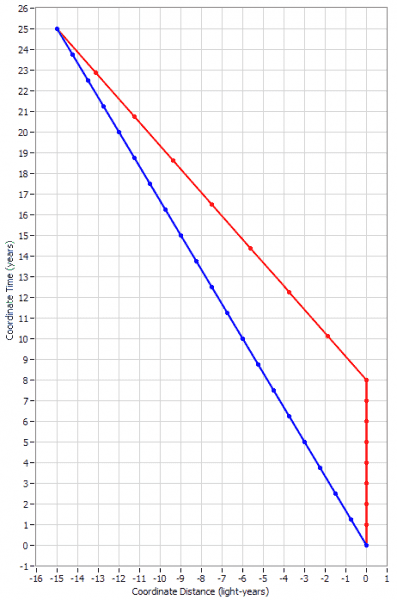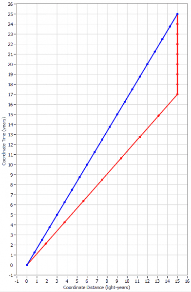 Perhaps a concrete example will help. Let's consider a typical Twin Paradox. I'm going to depict the Earth twin in blue and the traveling twin in red. The traveling twin departs Earth at a speed of 0.6c and after 8 years according to his clock, he turns around and spends another 8 years coming back at the same speed. When he reunites with the Earth twin, they find that the Earth twin has aged 25 years while the traveling twin has aged 16 years. The dots on this diagram mark off one-year increments of time for both twins: