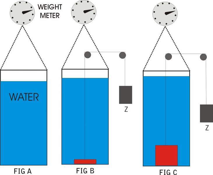 in this setup we have a bucket of water 10 kgs of water inside. Attached is a weight meter measuring that in fig a. The weight is exactly 10kgs.