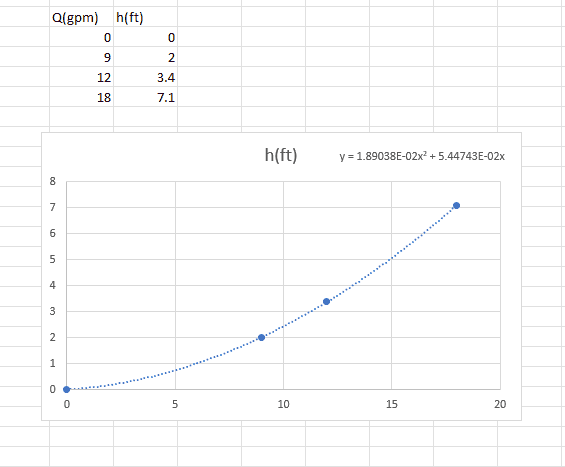 From the bottom of this tank the water flows through a heat exchanger. All I have on the heat exchanger to work with is (3) data points relating change in pressure with flow rate. I used curve fitting software to come up with a quadratic equation to describe this.