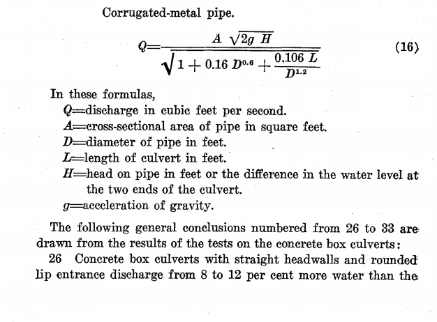 The discussion focuses on calculating water flow through an 18-inch corrugated culvert, specifically addressing the variables involved in the flow rate (Q). Key parameters include the diameter (D) of 18 inches, length (L) of 40 feet, and head (H) of 12 inches plus additional height differences. The correct methodology for these calculations is outlined in the HDS5 document from the U.S. Department of Transportation, which emphasizes that a single equation cannot universally apply due to varying conditions affecting flow. Users are cautioned about potential inaccuracies in nomograms for corrugated steel pipe culverts.