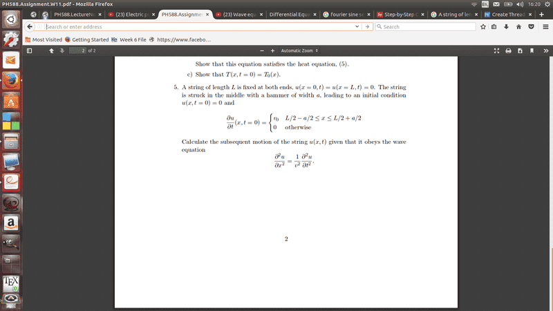 A string of length L is fixed at both ends ##u(0,L)=u(L,t)=0## The string is struck in the middle with a hammer of width a, leading to an intial condtion ##u(x,0)=0## and