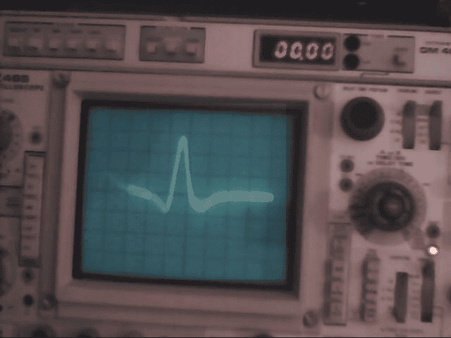 The coil is a spool of 30 AWG wirewrap wire I had around (no idea how many turns, many) and the oscilloscope is a Tektronix 465.