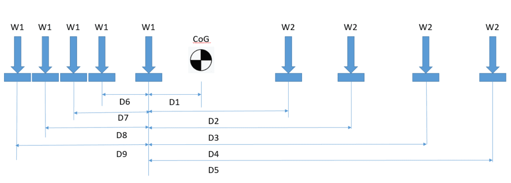 Where Wr is weight at rear, Cg is distance from front support to Center of mass and D is distance between the 2 supports. Wf is weight at front.