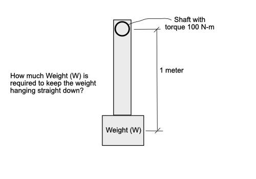 The discussion centers around determining the weight required to keep a weight hanging straight down on a rotating shaft, given a known torque. It explores theoretical implications and calculations related to torque and weight, while considering various assumptions and conditions.