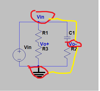 - Some participants question the correctness of the initial equations proposed for the circuit analysis, suggesting that the output voltage does not involve ground and that both Vo+ and Vo- should be included in the KCL equation.