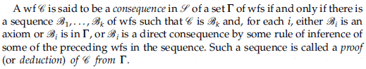What I got from the statement above, which is obvious, I guess, is that in the sequence of [itex]\mathcal{B}_1,\mathcal{B}_2,...\mathcal{B}_k[/itex] there are "SOME" well-formed formulas (wfs) that elements of [itex]\Gamma[/itex] set of wfs, or axioms that are NOT elements of [itex]\Gamma[/itex], or direct consequences by some rule of inference of some the preceding wfs in the sequence. To me, It also seem to be possible that "ALL" of those [itex]\mathcal{B}_k[/itex] wfs can by definition be one of the three possibilities mentioned above. Hence, we cannot say [itex]\Gamma=\{\mathcal{B}_1,\mathcal{B}_2,...\mathcal{B}_k\}[/itex].
