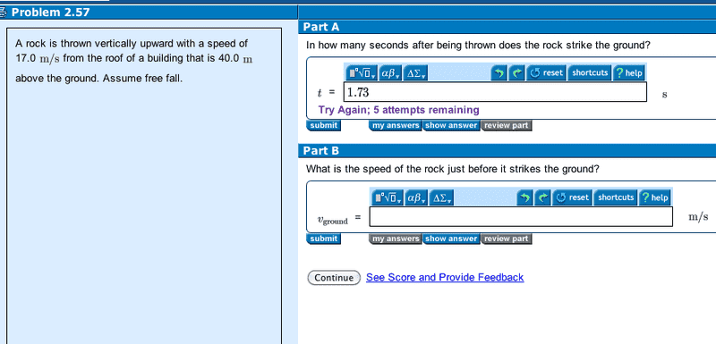 The discussion revolves around a basic projectile motion problem, specifically focusing on the equations of motion for both horizontal and vertical displacements. Participants are examining the application of kinematic equations in the context of a stone thrown vertically upward.