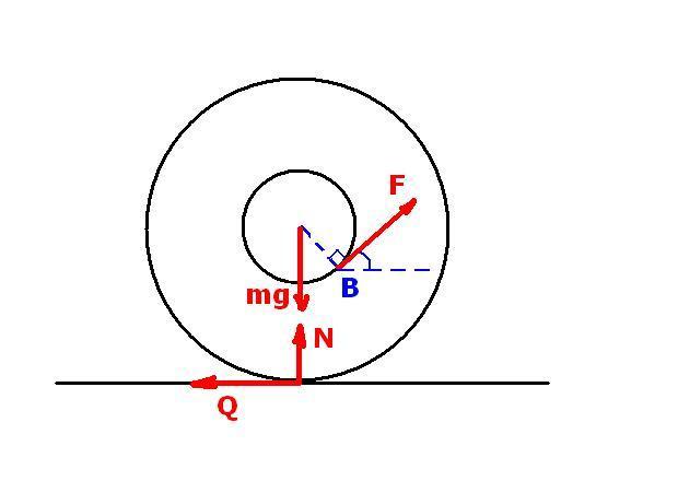 The yo-yo is made of two wheels, connected by a short beam (the cross-section of the beam looks like the letter "H"), around which wire is wrapped up. Let the yo-yo be stationary on a desk. What is the angle ß in relation to the said desk (see picture) that we must gently pull the wire so as not to cause the yo-yo to roll?