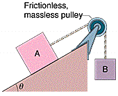 Body A weighs 110 N, and body B weighs 37 N. The coefficients of friction between A and the incline are μs = 0.56 and μk = 0.25. Angle θ is 40°. Let the positive direction of an x-axis be up the incline.