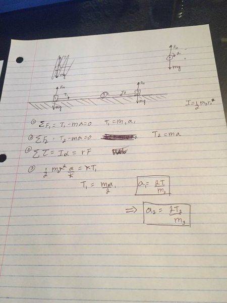 I set up three equations using force diagrams. For mass 1 I have T1 = m1a. For mass two I have T2 = m2a. For the pulley I used Torque = (1/2)MR^2 * alpha = rF where there are two cases of F being T1 or being T2.