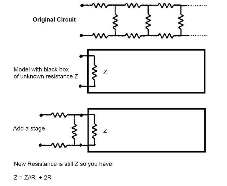 A circuit extends forever to the right, and all the resistors have the same value ##R##. Calculate the equivalent resistance measured across the two terminals at left.