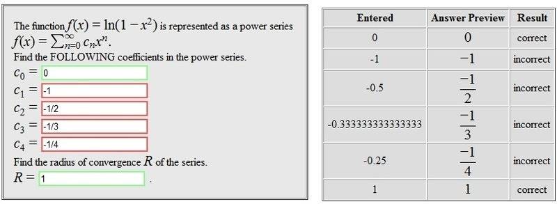 (-1/2), (-1/8), (-1/24), (-1/64), (-1/160)I then inputted these numbers into the boxes specified on the web page and I received a message saying that they were wrong. I've checked my work twice, my TI89, and even Wolfram Alpha; I get the same answers from these sources, so can someone tell me what is wrong? Also if someone does have a solution, you do not have to tell me what the actual answers are, just notify me with what I did wrong.