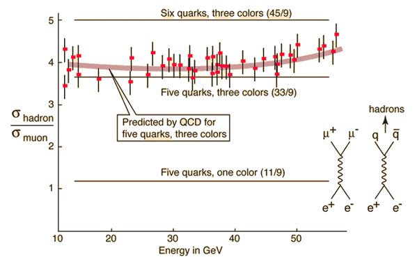 At this point, we may pause a little while. All of the above would still hold even if the SU(3) color would be approximate, in the sense that it would be slightly broken by a tiny gluon mass. "Tiny" must be compared to the typical hadronic scale, in between the pion and proton mass say. So 1 MeV is small and can easily hide. The data above is obtained at large energies. Electron positron annihilation does all sorts of nasty stuff around the GeV scale, due to contributions from various resonances of various width, as you can see in