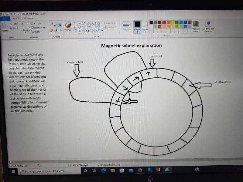 The idea is to insert in each wheel of a car two rings of permanent magnets, that will allow to levitate the vehicle on a flat track made of thin aluminum sheets covered with a pattern of laminated conductor strings shorted at their end that forms a close packed array.