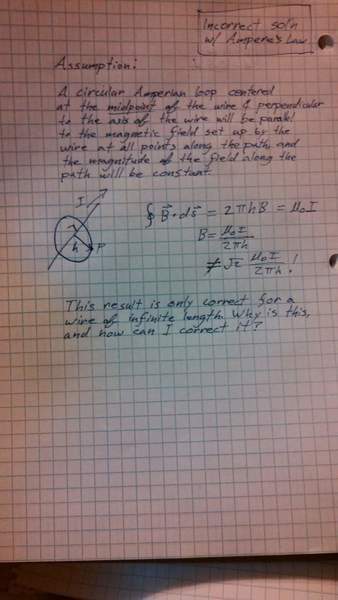 I have been very perplexed these past few hours, trying to figure out why Ampere's law (at least, as I applied it) does not seem to yield the correct magnetic field at some distance from a wire of finite length.