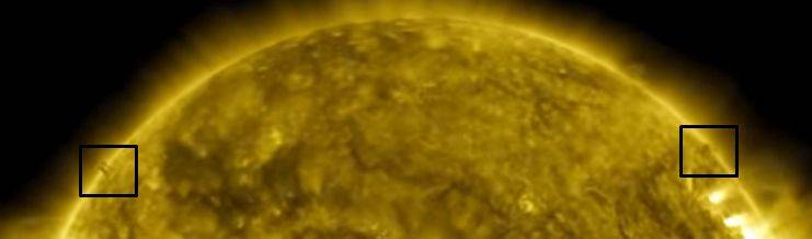 Each linear dark feature usually (but not always) has a thin jagged light line along the centreline. At the limb of the Sun, each jagged centreline appears as a dark spike that protrudes well above the surroundings and is so dark that it obscures flares and spicules behind it. The second image from 0:33 shows three such dark spikes, two on the left and one on the right, which are always aligned with the thin centreline of a dark feature.