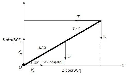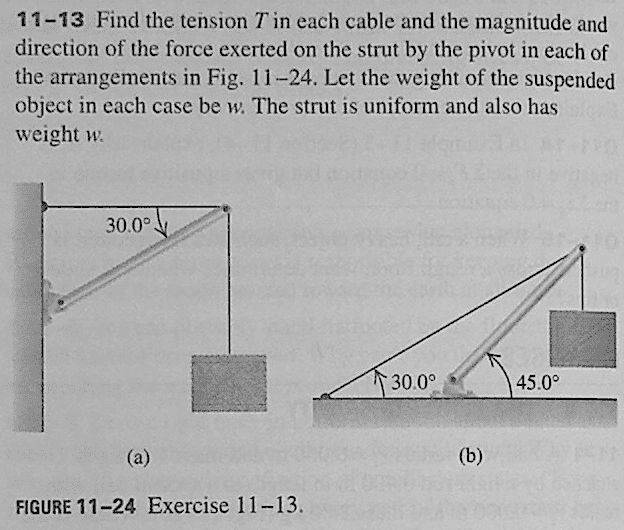 A strut is attached to a wall in such a way that it can pivot. It is currently angled $30^{\circ}$ up from the horizontal, and held in place by a cable. This cable is attached to the wall just above the pivot, and the cable runs out horizontally to the tip of the strut, and then curves over the strut, and down to a weight $w$. The strut is of uniform density, and also has weight $w$. Find the tension in the cable, and the magnitude and direction of the force exerted on the strut by the pivot.