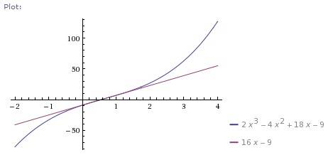 The line y = 16x - 9 is a tangent to the curve y = 2x^3 + ax^2 + bx - 9 at the point (1, 7).