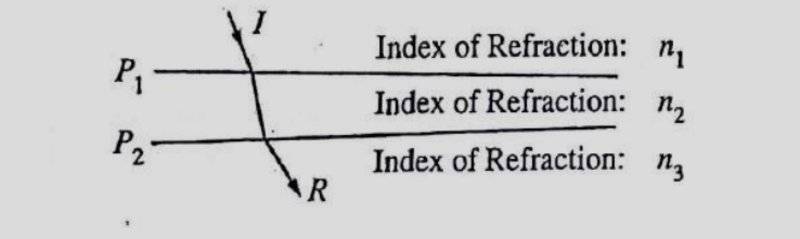 In order for the refracted ray R to have the same direction in space as the incident ray I, shown above, which of the following conditions by itself would be sufficient? (A) n1=n2 (B) n1=n3 (C) n2=n3 (D) Plane surface P, is parallel to plane surface P2- (E) None of the conditions above would be sufficient by itself.