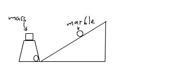 We did an experiment in class where a marble was released down a ramp and traveled a short distance before entering a hole inside an upside down cup, causing the cup to get displaced. Different masses were placed on top of the cup and the resulting displacements were measured. We have to discuss the physics behind the experiment. We graphed distance against mass on top of the cup.
