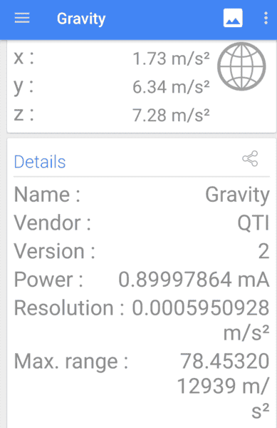 p.p.s. I found an Android app called sensors multitool that revealed lots of interesting info about my device such as in the screenshot below. (If I hold it vertically, it does show 9.8 ##m/s^2##)