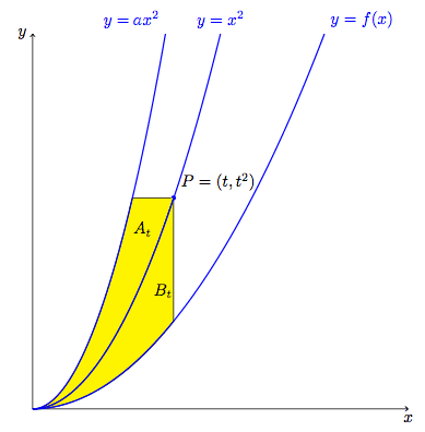 Let $f(x)$ be an unknown function defined on $[0,\infty)$ with $f(0)=0$ and $f(x)\le x^2$ for all $x$. For each $0\le t$, let $A_t$ be the area of the region bounded by $y=x^2$, $y=ax^2$ (where $1<a$) and $y=t^2$. Let $B_t$ be the area of the region bounded by $y=x^2$, $y=f(x)$ and $x=t$. See the image below: