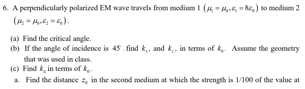 The discussion centers on the interpretation of a complex transmission angle encountered in wave propagation analysis. The user expresses confusion regarding the significance of obtaining a complex number for the transmission angle in part (c) of their problem. It is clarified that when a wave transitions between different media, it can produce a surface wave characterized by a guided wave along the interface, resulting in an elliptical E field vector. The user is advised to utilize the complex number in the cosine function and incorporate the wave number K0 for further calculations.