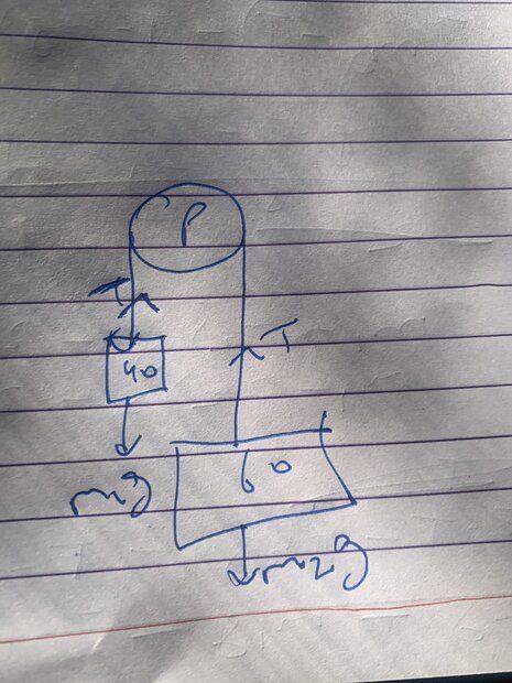 The discussion revolves around the dynamics of an Atwood machine, where two bodies of different masses are connected by a string over a pulley. Participants explore the factors affecting the acceleration of the hanging bodies and the force balance involved in the system.