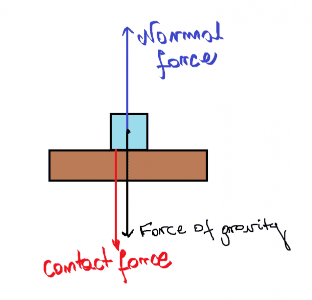 - Another participant emphasizes that the contact force exerted by the block on the floor is equal to the weight force of the block, indicating that the forces are in equilibrium.