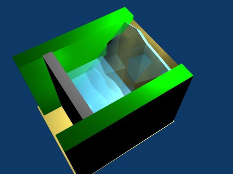 This 3-d image above is the same as the 2-d image; the gray block is the wall of the dam, the brown plane is the ground, and it has water (blue) flowing which's getting accumulated along the block...the other 2 walls which have been referred previously are a part of the valley which have been shown as green; thus the preferred place to grow a dam is between walls of a valley...also notice that the height drop of the river is within the valley, if there's no height drop at any place in the valley, the whole valley is unsuitable for dam construction.Am I right about whatever I've written here?