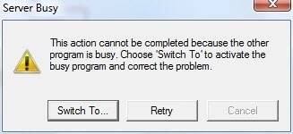 "This action cannot be completed because the other program is busy. Choose 'Switch To' to activate the busy program and correct the problem."