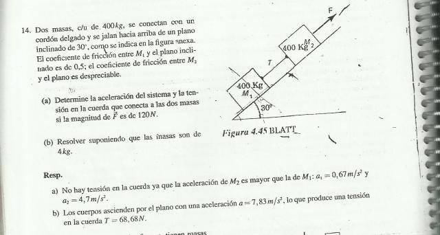 (a) determine the acceleration of the system and the tension in the cord that connects the two masses if the magnitude of the force F is of 120N.