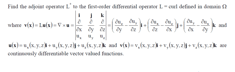 The discussion revolves around finding the adjoint operator of the curl operator in the context of differential equations. The original poster presents a problem involving the adjoint operator L* to the first order differential operator L = curl, and expresses confusion regarding the definitions and calculations involved.