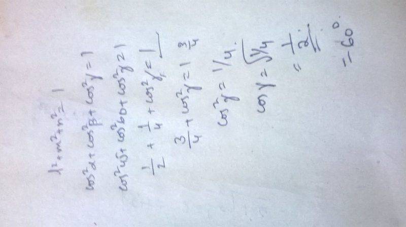 You do get 1!Leelakrishna23 said:And i didn't get the cos^2 alpha + cos^2 beta + cos^2 gama=1. Can you please explain me?