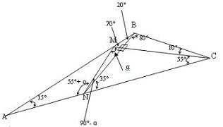 $$\sin \alpha=\dfrac{CN\sin 55^{\circ}}{\dfrac{\sin 15^{\circ}\dfrac{CN\sin 35^{\circ}}{\sin 80^{\circ}}\cdot\dfrac{\sin 100^{\circ}}{\sin 70^{\circ}}\cdot\dfrac{\sin 55^{\circ}}{\sin 15^{\circ}}}{\sin (55+\alpha)^{\circ}}}$$
