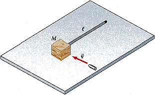 A wooden block of mass M resting on a frictionless, horizontal surface is attached to a rigid rod of length L and of negligible mass. The rod is pivoted at the other end. A bullet of mass m traveling parallel to the horizontal surface and perpendicular to the rod with speed v hits the block and becomes embedded in it.